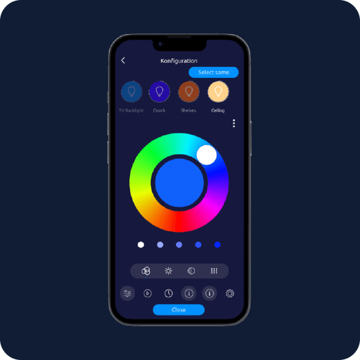 Enables precise control of individual or multiple lights. Includes Scenes and Animation Editor for color sequences. Can be controlled by App, Push Switch or Voice*