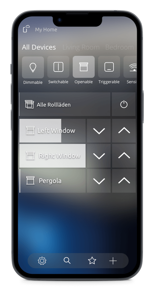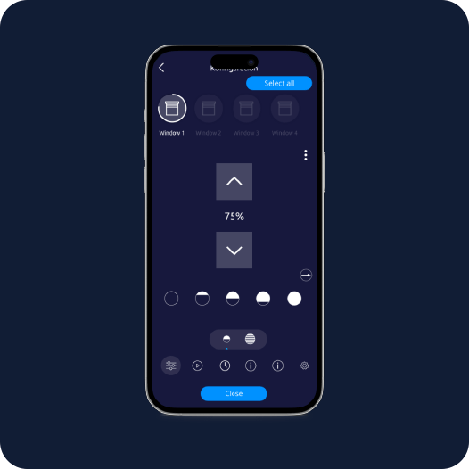 The Roller Shutter Interface enables precise control of roller shutter controller including position and slats angle. Multiple shutter controller, connect to each other via Bluetooth Mesh and can be controlled individually or as a group. Additional features such as Rules and Timers for automation, or integration with battery-free switches or sensors, are also included.